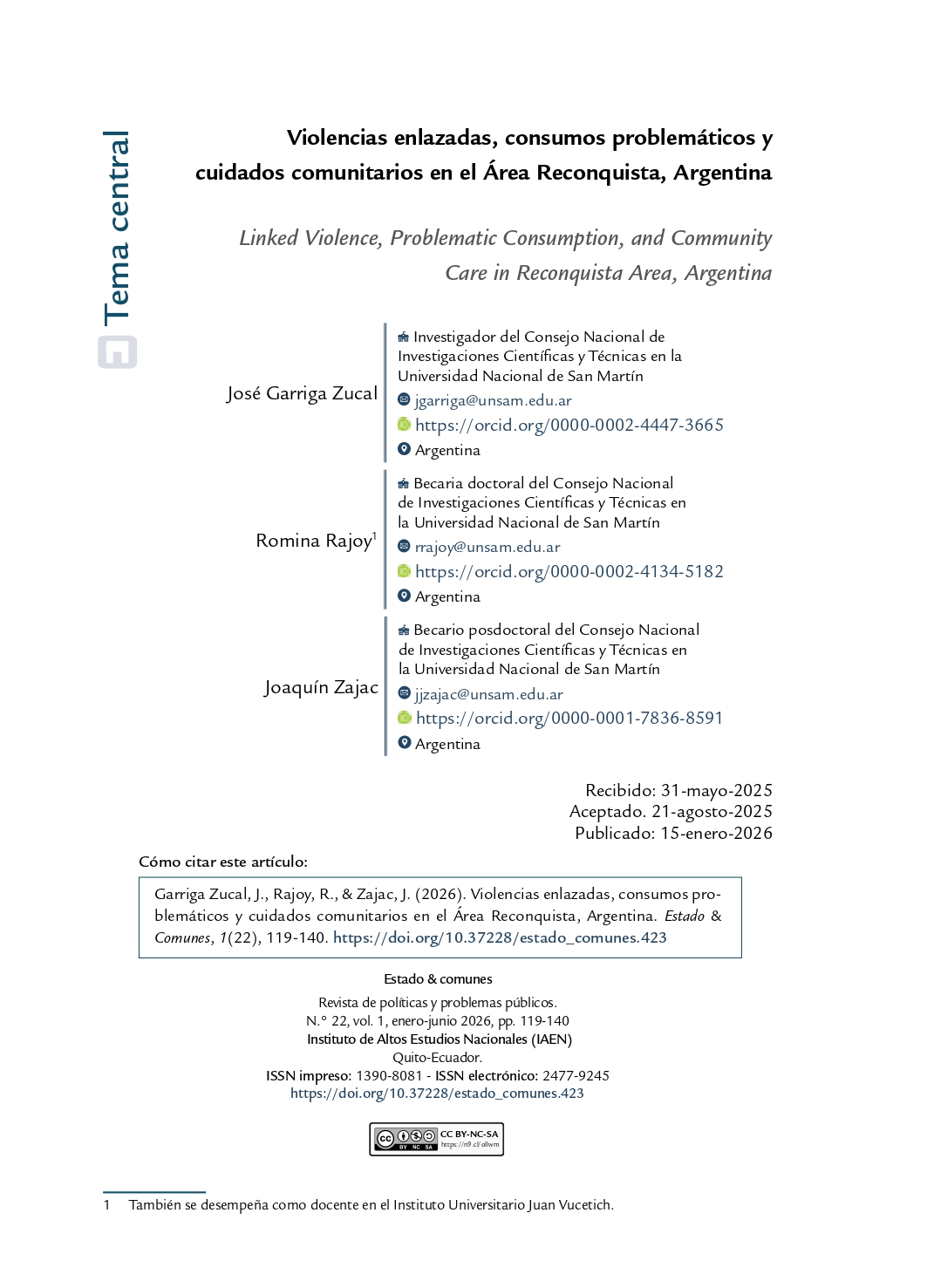 Este artículo analiza la relación entre violencias, consumos de sustancias y cuidados comunitarios en los barrios populares del Área Reconquista del conurbano bonaerense de Argentina entre 2001-2022. Se trata de un estudio de caso que incluye observación participante en territorio y entrevistas a vecinas barriales. Mediante el empleo de la categoría de ‘violencias enlazadas’ se encuentra que el microtráfico, el endeudamiento, la violencia de género e institucional, la precariedad ambiental y las disputas territoriales, se entrecruzan y refuerzan mutuamente, lo que configura una red de daños persistentes en estos barrios. Las respuestas barriales —comedores, redes vecinales y organizaciones locales— ofrecen contención parcial frente a la violencia, aunque sin capacidad de revertir las causas estructurales de la violencia.